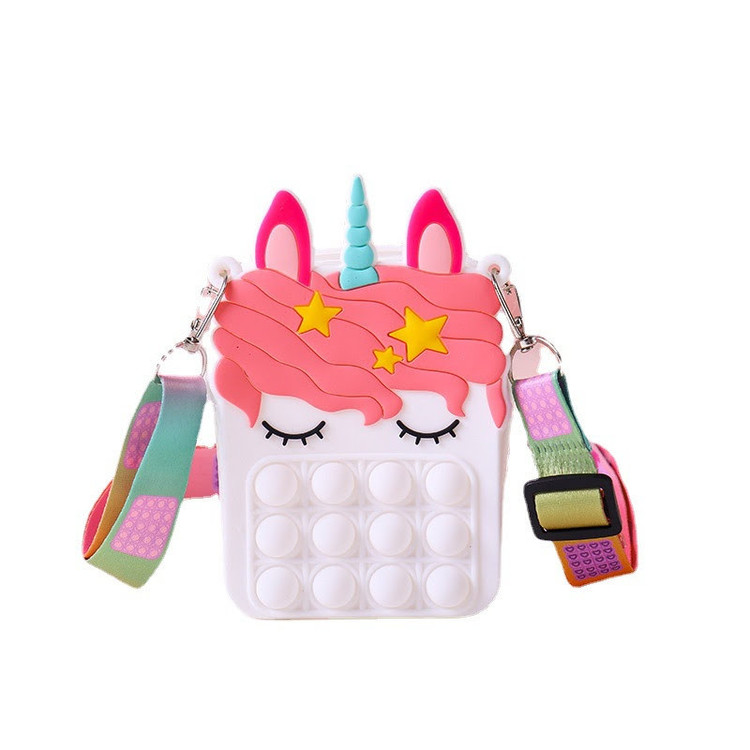 کیف سیلیکونی پاپیتی یا فیجت ضد استرس طرح یونیکورن یک کیف فانتزی و محصولی با کیفیت و مرغوب می باشد. این محصول به خاطر سیلیکون با کیفیتی که دارد دارای ماندارگاری بالا و قابل شست و شو می باشد و می تواند هدیه مناسبی برای کودکان و نوجوانان باشد. ابعاد این کیف با ارتفاع 13 در عرض 10 سانتی متر و دارای یک بند بلند دوشی است. از کاربردهای این کیف می توان به فضای کافی جهت قرارگیری انواع کابل های شارژ تلفن همراه، هندزفری، کارت عابر بانک، کالاهای کوچک و مموری کارت ها اشاره کرد. یکی دیگر از کاربردهای جذاب قابل ذکر برای این محصول، قرار دادن برخی از اقلام لوازم آرایش، آینه و ... از دیگر آیتم هایی است که می توان داخل کیف جا داد. دارا بودن زیپ با کیفیت جهت بازو بسته کردن محفظه کیف ضامن امنیت محتویات داخل آن می باشد