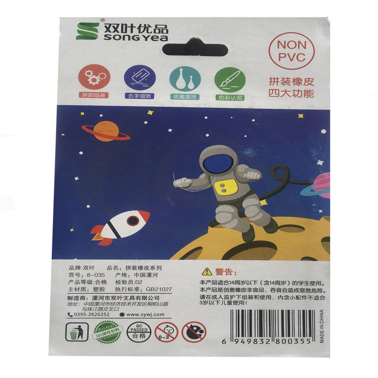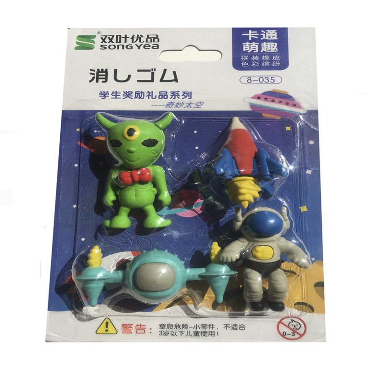 ست پاک کن فانتزی لگویی با قابلیت جدا شدن و بارها مونتاژ مجدد می باشد .دارای 4 تکه با تم فضایی شامل سفینه وآدم فضایی و موشک و فضا نورد بوده و این محصول علاوه بر فانتزی بودن مناسب پاک کردن نیز می باشد و بسیار تمیز و بدون رد سیاهی مداد مشکی را پاک میکند . همچنین دارای بوی دلنشینی می باشد که کودکان شما را مجذوب میکند.