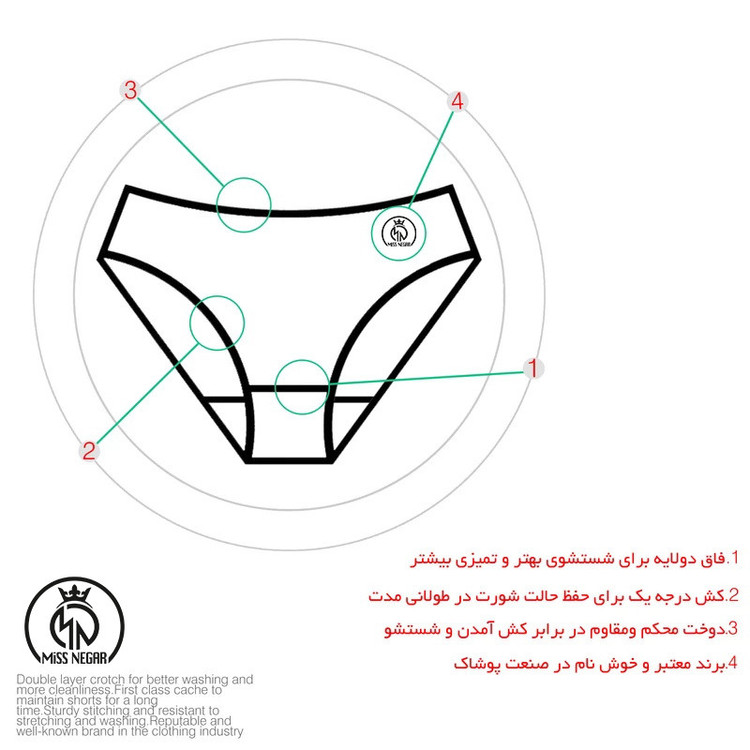 برند miss negar با تیمی مجرب از متخصصین پوشاک، طراحان حرفه ای و مهندسین صنایع نساجی طبق نیاز خانواده های خوش پوش اقدام به تهیه شورتکس هایی از الیاف طبیعی با بافت مدرن نموده است . شورتکس بهداشتی miss negar ضد رطوبت دارای لایه اضافی ضد رطوبت مناسب تهیه شده، در تولید شورتکس های miss negar از الیاف پنبه طبیعی و ضد حساسیت و ضد عرق استفاده می شود تا خانم ها به راحتی و با اطمینان کامل اقدام به خرید یک شورتکس با کیفیت و استاندارد نمایند. با استفاده از شورتکس بهداشتی نگرانی از نشت خون و کثیف شدن لباس های خود نخواهید داشت. فاق بلند و پارچه کشی این محصول موجب احساس اطمینان و راحتی بیشتر می شود.