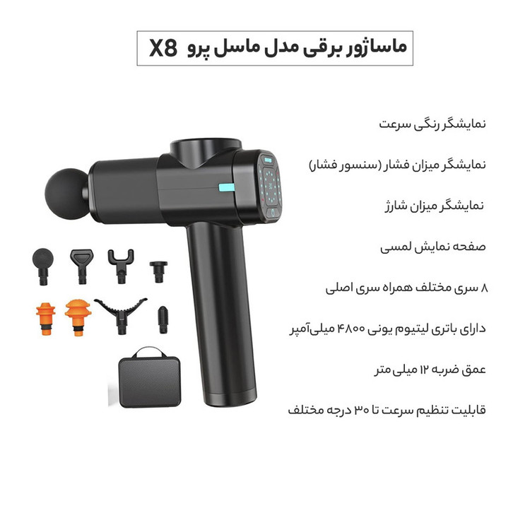 ماساژور تفنگی معروف و معتبر ماسل پرو در دسته بندی ماساژورهای حرفه ای قرار دارد.این ماساژور علاوه بر زیبایی و طراحی خاص دارای نمایشگر رنگی سرعت و نمایشگر میزان فشار(سنسور فشار) و نمایشگر میزان شارژ و همچنین صفحه نمایش تاچ میباشد.8 هد مختلف از جمله 1 هد ایرکامپرشن برای نواحی اسیب دیده,از ویژگی های خاص این محصول میباشد.دارای باتری لیتیوم یونی 4800 میلی امپر نسل جدید و عمق ضربه 12 میلی متر واقعی میباشد. موتور این محصول از نوع براشلس با توان و گشتاور بالا میباشد.قابلیت تنظیم سرعت تا 30 درجه مختلف و 3200 دور در دقیقه را داراست.