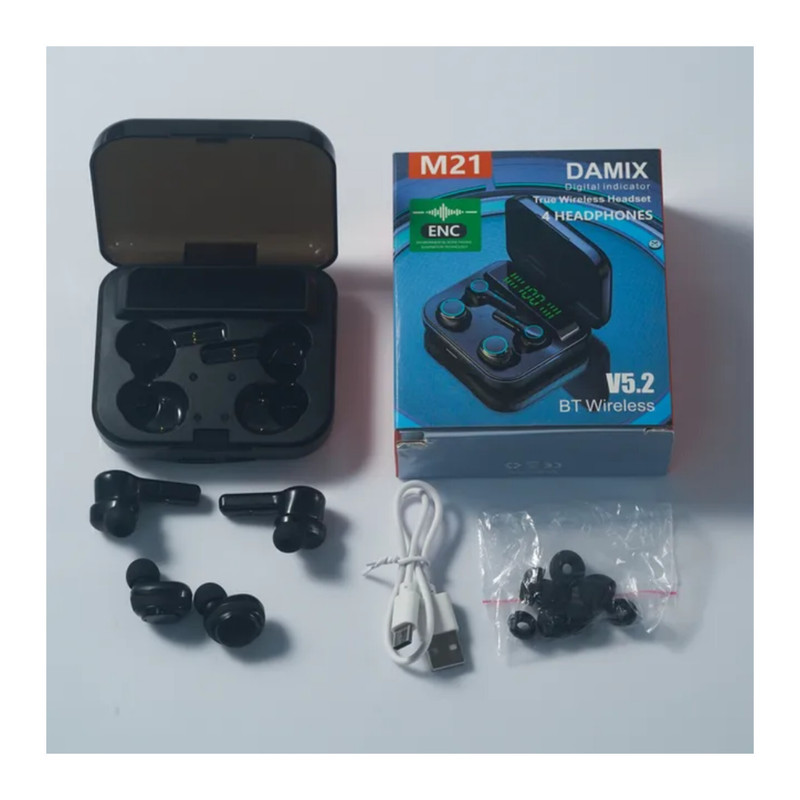 هندزفری بلوتوثی مدل TWS-M21 چهار هد شامل دو هد رو گوشی و دو هد حلزونی تو گوشی از جدیدترین مدلهای هندزفری تو گوشی که امکان مکالمه راحت و با کیفیت بدون تقطیع صدا به مدت بیشتر از 5 ساعت و یا لذت بردن از موسیقی دلخواتون با صدای استریو را فراهم میکند,زیبایی ظاهر این محصول با چراغهای ال ای دی در کنار کیفیت بینظیر جذابیت این مدل را دو چندان میکند,در صورت عدم استفاده از محصول با یک بار شارژ تا280 ساعت فرصت استفاده از دستگاه را دارید.امکان قطع و وصل صدا تنها با یکبار لمس کردن هندزفری فراهم میشود و همچنین میتوانید با لمس هندزفری حالتهای کم و زیاد کردن صدا و استاپ موزیک و رد کردن موزیک را داشته باشید. از مزیت بینظیر این دستگاه این است که از کیس این دستگاه به عنوان پاور بانک برای شارژ گوشی همراه میتوان استفاده کرد و با پرداخت مبلغ کم از دو محصول پر کاربرد استفاده میکنید.فول شارژ دستگاه 2 ساعت زمان میبرد.امکان انتقال صدا تا فاصله 10 متری از منبع برای شما فراهم است. در جعبه 3 سایز مختلف هد (XS,S,M) برای راحتی شما تعبیه شده است.باتری نسل جدید لیتیوم پلیمری این دستگاه طول عمر بالای محصول رو ضمانت میکند و 1تا 2 شارژ کامل میشودو دفترچه راهنمای داخل جعبه شمارو برای استفاده راحتتر و مفید از محصول راهنمایی میکند