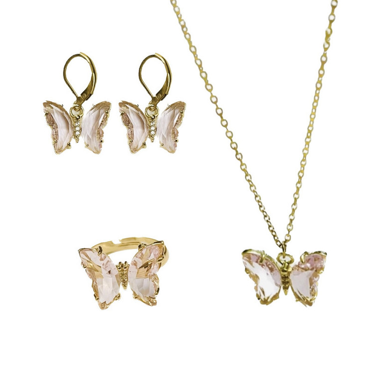 ست ارائه شده دارای گردنبند، جفت گوشواره و انگشتر پروانه کریستالی میباشد، زنجیر گردنبند از جنس استیل و رنگ ثابت بوده، انگشتر به صورت فری سایز و قابل تنظیم برای تمامی اندازه ها می باشد